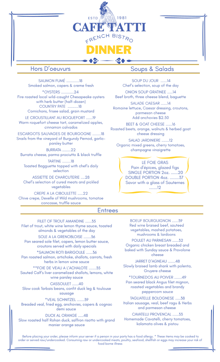 Overall, the menu at Cafe Tatti is a celebration of French cuisine, with something for everyone, whether you're craving a hearty entree or a light salad. The dishes are thoughtfully prepared with fresh ingredients, making it a perfect spot for a memorable meal.
